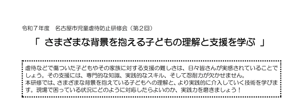 本研修では、さまざまな背景を抱えている子どもへの理解と、より実践的に介入していく技術を学びま